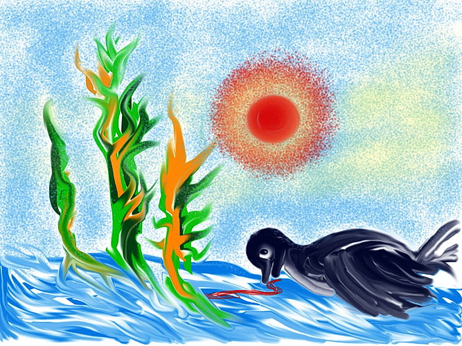 Über Lila, Streifi, Zacki, den Quallen und den vielen anderen Fischen schwimmt die Ente Quakie. Sie hat die Gespräche belauscht und ist etwas traurig, dass sie nicht auf Dauer zu den anderen tauchen kann. |